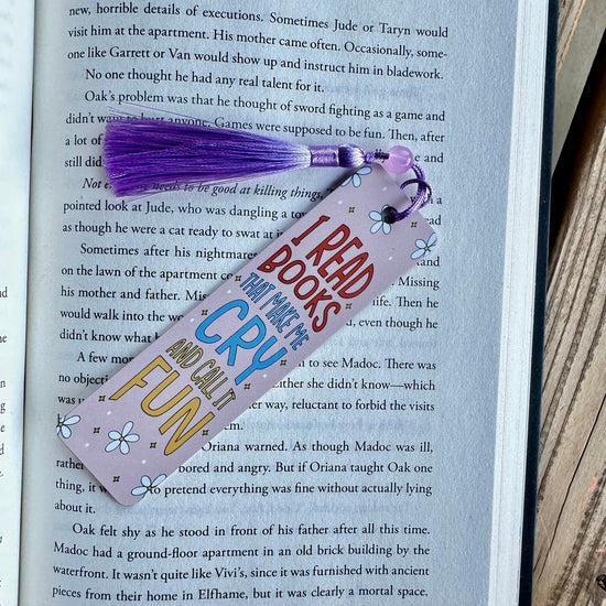 Our charming Pink Sublimated Metal Bookmark with a delightful tassel! This unique accessory features a whimsical design that reads "I read books that make me cry and call it fun" alongside adorable daisies. Perfect for any book lover who enjoys a touch of sentimentality while diving into their favorite novel. Keep your place in style with this lovely bookmark that adds a pop of color and personality to your reading adventures.