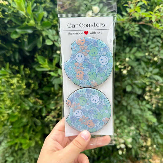 car coasters, car accessories, cute decor, gift for her, retro floral groovy, wavy checkered, girly car cup holder, bookish things, cool coasters, blue drink holder, purple trendy groovy, daisy happy face, fun vehicle decor